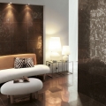 Teхнологический поиск THE ONE INTERIORS. Гранулы стали и стекла, нанесённые всухую непосредственно на линии и обожжённые при температуре 1200° являются результатом тщательного исследования и анализа керамической совместимости этих двух элементов. Особый тип металлизированных гранул в массе, использованный компанией CEDiR, не подвержен окислению и не измененяется со временем. Интенсивная обработка методом шлифовки, удаляющей оверхностные частицы керамики, дарует коллекции THE ONE INTERIORS притягательность игры света и бликов, характерных для металла и стекла. Коллекция выполнена в шести цветах; двух форматах: 60*60 и 30*60 с толщиной плитки 10,5 мм и дополнена необыкновенно интересными декорами Righe и Fiori.